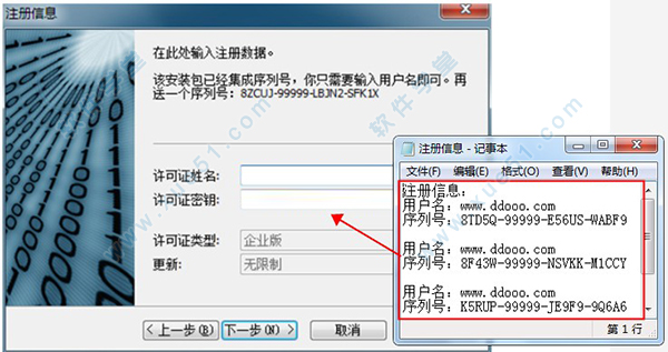 3、依提示安装,安装到这一步,将注册信息文件内任意一组注册码复制到软件方框内即可激活破解软件