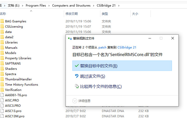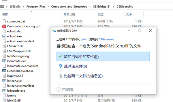 4、进入Crack/patch破解文件,以管理员身份运行csi_bridge_v21_kg.exe,会自动在当前目录下生成lservrc许可证文件,复制lservrc、SentinelRMSCore.dll到下面的路径