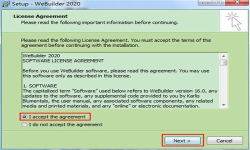 2、运行安装程序,进入安装界面,选择第一项接受并同意软件许可协议,点击next进入下一步