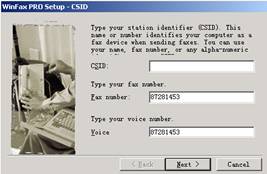 4、解压安装过程中会出现如图1所示的对话框,在这个对话框中要求输入您所使用的电话号码。如果您的Modem支持语音传真,则还可以进行语音传真,输入同样的电话号码。如果要您的网络中有多个这样的传真设备,为了便于区分,则还可以输入一个表示此传真设备的位置号码(CSID)或者名称,也可不输入。