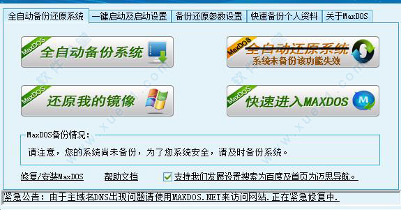 maxdos工具箱这是一款DOS工具箱同一类的产品。它的原理是利用Linux环境下的开源软件Grub之Windows版(Grub4Dos),在Windows下把Dos的引导文件给加进去,并修改引导区,使引导区出现进入Dos的选项。maxdos工具箱为用户提供了全自动备份/还原系统、一键启动及启动设置、还原我的镜像、快速进入、备份还原参数设置、快速备份个人资料等强大功能,另外,支持发展设置搜索为百度及首页为迈思导航,方便用户的使用。需要注意的是,在进行备份情况下,你的系统尚未备份,为了您的系统安全,请及时备份系统。