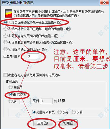 2、设定面页出血尺寸,设定好之后点应用好之后点关闭。注意单位,如果不是毫米,看下一步:是毫米的话,请省略;