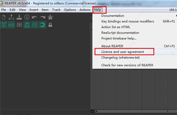 9、随后启动软件点击“help”选择“License and user agreement”。