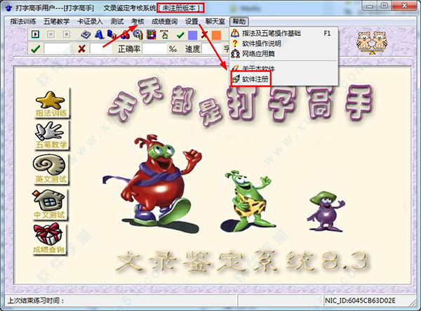 1、在本站下载软件包,将其解压好,双击运行“打字高手绿色版”文件夹里面的“wwt.exe”打开软件,你可以看到此时的软件还处于未注册状态,点击“帮助”—“软件注册”。