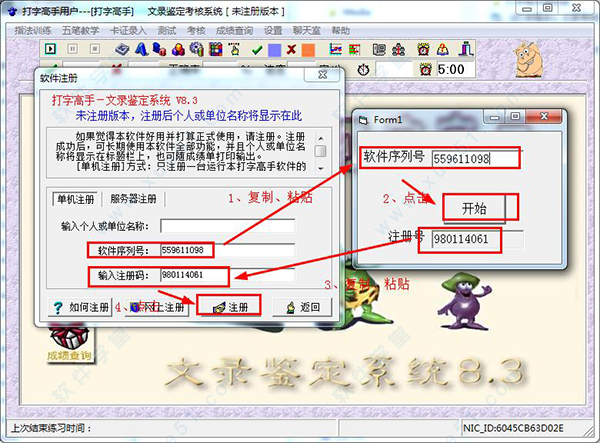 2、出现注册界面,将安装包内的“《打字高手》文录考核8.3注册机.exe”注册机打开,第一:将注册页面的序列号的复制到注册机内;第二:点击“开始”,生成注册号;第三:将注册号复制粘贴到软件的注册页面;第四:点击“注册”。