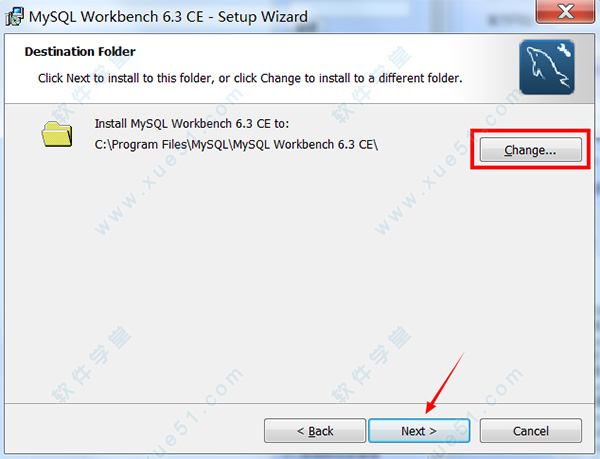 2、自定义软件安装路径,默认安装路径为“C:\Program Files\MySQL\MySQL Workbench 6.3 CE\”,安装路径在选择时不要选择带有中文符号的路径,点击“Next”进行安装;