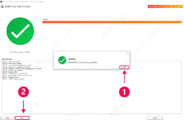 完成刻录后,您可以关闭通知消息 (1)。点击 “主页” 返回到开始页面 (2)。