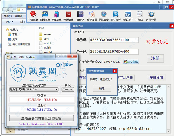 3、然后将文件内注册机复制到软件安装路径下并运行它,弹出界面,给力系列软件选择给力牛津辞典 v3.6.0.8,接着点击生成注册码并复制到剪切板,获取并生成注册码,注册码也复制成功