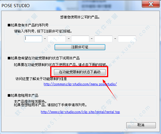 2、弹出产品使用窗口,我们直接点击“在功能受限制的状态下启动”即可;