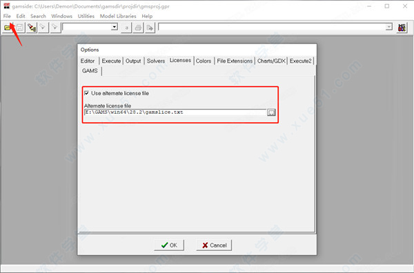 3、在桌面运行打开软件,进入主界面点击File选择Options-Licesne,勾选Usealternate license file,选择刚刚复制到软件安装路径下的gamslice.txt许可文件即可激活软件