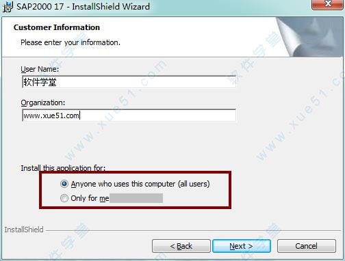 3、用户名输入:软件学堂;组织输入:www.xue51.com,然后下面的话如果你的电脑只有一个用户那就随便选不影响