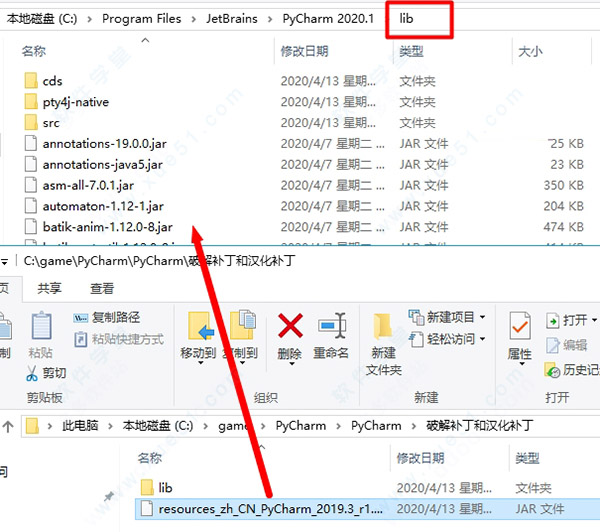 1、关闭软件,再次回到破解补丁和汉化补丁文件夹,将resources_zh_CN_PyCharm_2020.1_r1.jar汉化补丁包复制到软件安装路径lib文件下即可