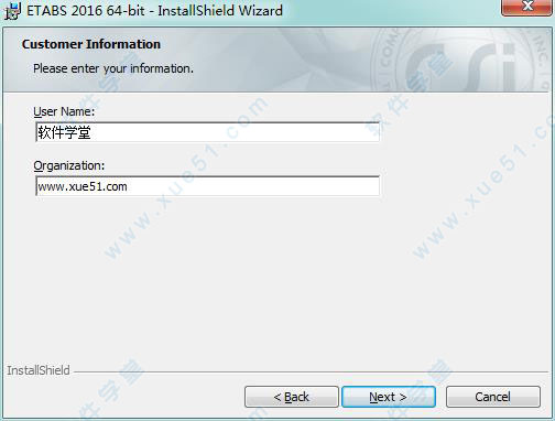 3、用户名和组织名称分别输入:软件学堂、www.xue51.com