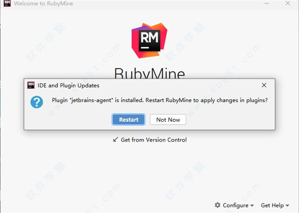 4、软件打开之后,弹出激活方式,首先选择activation code,然后点击为RubyMine安装,最后点击是重启软件