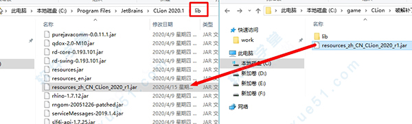 1、将resources_zh_CN_CLion_2020_r1.jar汉化补丁包复制到软件安装路径lib文件下即可