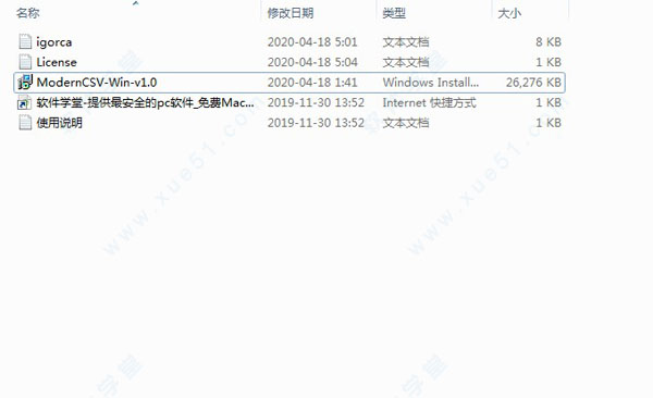 1、下载好文件包,得到软件Modern CSV(csv文件编辑器) 64位破解版安装程序和破解文件