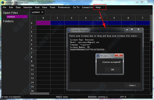 4、依提示完成软件安装,软件安装成功后,在桌面运行启动软件,进入主界面点击点击Help下拉的第三个,再将破解文件夹下的许可文件拖入进去即可,如下图所示,提示license accepted!表明软件已成功注册激活,至此,Modern CSV破解版成功安装破解,用户可以放心使用了