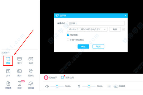 2、在左下角的直播素材中选择“抓屏”选项,弹出显示器的选择界面,之后选择确定即可,如下图所示: