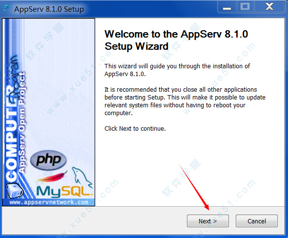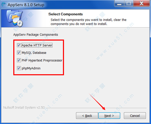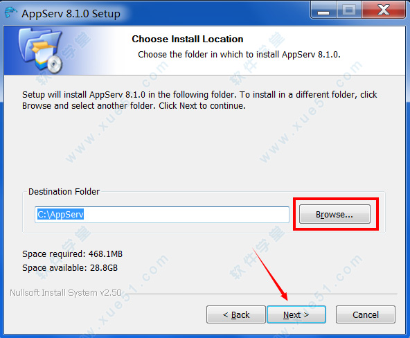 2、同意软件许可证协议并自定义软件安装路径,默认安装路径为“C:\AppServ”,点击“Next”按钮继续安装;