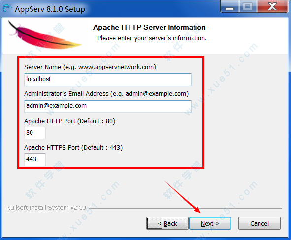 4、设置服务器的地址和端口,如果您是本机使用,填localhost即可,邮箱填自己的邮箱,默认端口为80,如果您之前有安装类似的工具,占用了80端口,建议更换为其他端口进行使用;