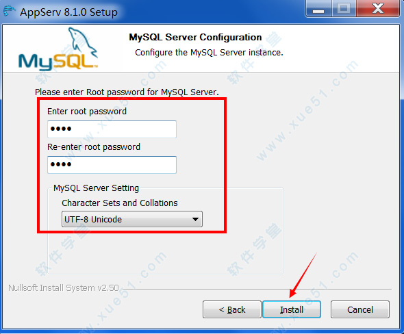 5、设置mysqlserver数据库的密码,默认帐号为root,编码格式默认为utf-8;