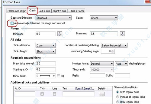 8、X轴同样双击后去除自动调整坐标范围,自行对坐标范围进行定义;