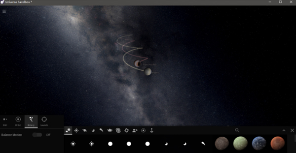 ps:在这种模式下有一个子项,Balance Motion,当将它打开时,两个物体会相互围绕中心一点转动,形成了一个圆形或环形运行轨道,这个圆接近于正圆这种模式比较适合模拟双星运动或三体运动。