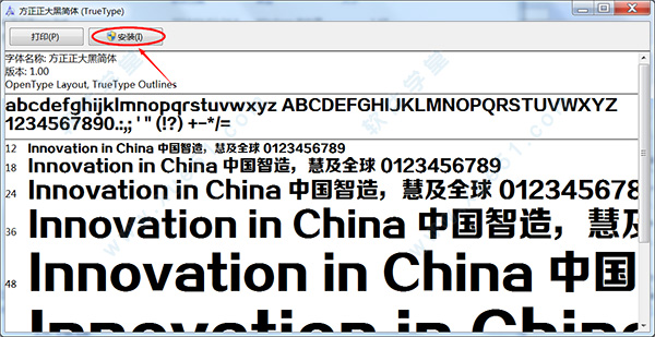 将压缩包解压以后,找到“方正正大黑简体.TTF”字体文件,双击运行该文件,在弹出的安装窗口中点击“安装”按钮进行字体的安装;