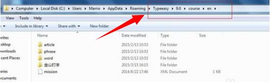 2、接着我们在我的电脑中,将前面找到的路径复制粘贴过来,向前返回到....\Typeeasy\9.0\course\en\ 目录,其中有一个article,就保存了我们平时练习的英文文章,看一眼还挺多的。从1-80,文件类型为xml文件。你可以用记事本打开或者