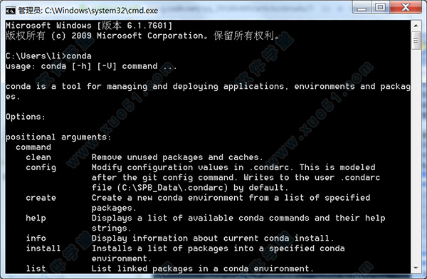 5、验证软件是否安装完成,打开命令行窗口,输入conda,出现如下界面则表示安装成功了;
