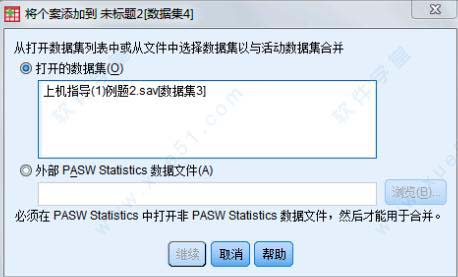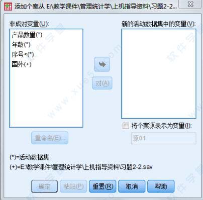 (3)增加个案的数据合并(【合并文件】→【添加个案】) 将新数据文件中的观测合并到原数据文件中,在软件中实现数据文件纵向合并的方法如下: