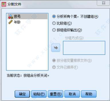 在进行统计分析时,经常要对文件中的观测进行分组,然后按组分别进行分析。例如要求按性别不同分组。在SPSS中具体操作如下: