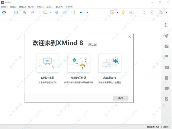 思维导图软件,在原版本软件基础上增加了许多新功能,例如支持幻灯片演示,从思维创建幻灯片;为用户带来全新的工作区,新设计帮助提高思维图编辑效率;新增高分屏支持,高分辨率屏幕上使用户体验更佳!它可用于创建头脑风暴会议的思维图,也可以让你轻松制作交互式演示文稿,允许用户填充大量的主题、想法和任务,轻松定义对象之间的关系,让大家一目了然地知道它们的所表示关系,了解整个图形关系链的来龙去脉,使客户与你之间的关系更加进一步,沟通全程无障碍。这里为大家带来了xmind 8 update 9免激活版下载,需要的用户快来这里免费下载体验吧,这里免费为你提供资源,刚好是你现在所需要的,不需要到处去找资源了。