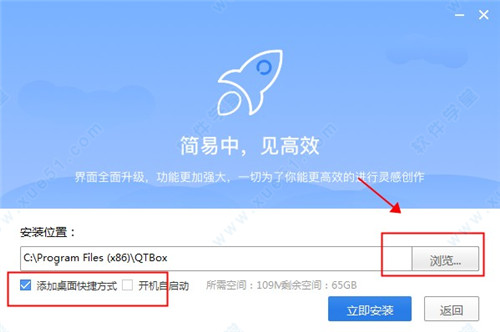 3、默认安装在C盘,推荐安装在除C盘之外的其他盘,点击浏览可以更改安装位置,快捷方式、开机自启等附加根据自己的需求选择。