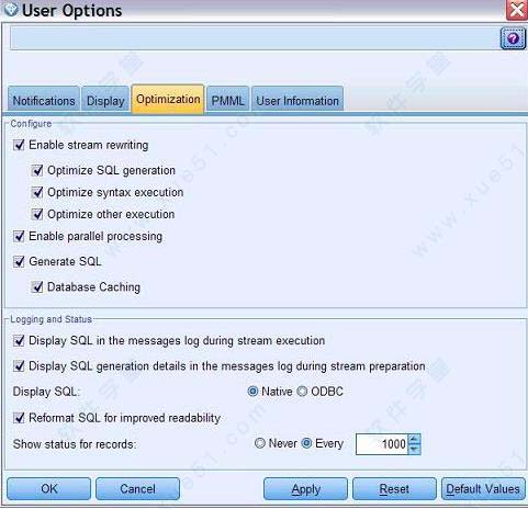 一、配置 IBM SPSS Modeler 以支持SQL生成与优化1、优化 SQL 生成:选中该选项可以对流中的节点进行重新排序,以便将更多的操作提交到数据库中执行。当发现某个节点所执行的操作无法包含到 SQL 中时,该优化选项会向流的后继节点查看,搜索符合条件的后继节点,在不影响流语义的情况下将该后继节点提前至该节点之前。