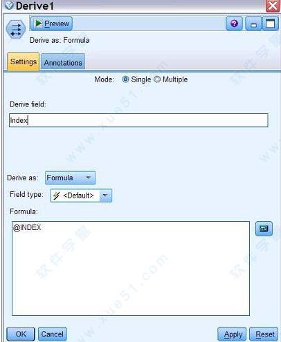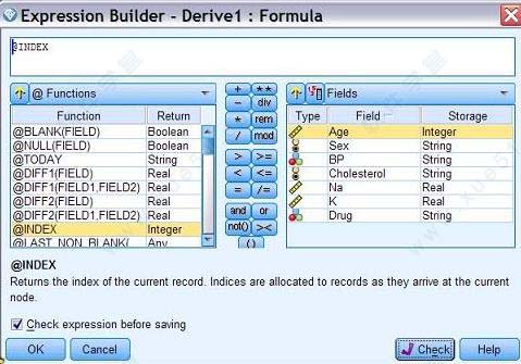 这里,我们将 Modeler 示例文件夹中的 Drug1n 数据取出,增加索引字段并创建名为 Drug1nID 的表。首先插入文件源节点,选择 Drug1n 数据文件并查看字段类型及定义。在文件源节点之后插入导出节点,使用表达式构造器添加索引字段