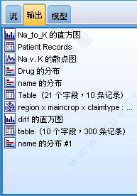 输出选项卡中包含由 SPSS Modeler 中的流操作生成的输出或图形文件。您可以显示、保存、重命名和关闭此选项上列出的表格、图形和报告。