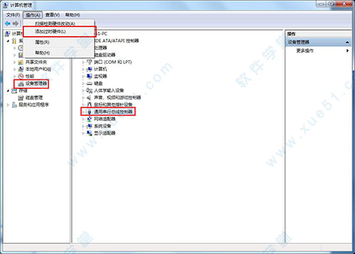 5、右键“我的电脑”,选择“管理”,打开“计算机管理”窗口,在左侧工具栏中选择“设备管理器”,同时在右侧的打开菜单栏中选择“通用串行总线控制器”,在正上方工具栏中选择“操作”,弹出的下拉框中选择“添加过时硬件”按钮;