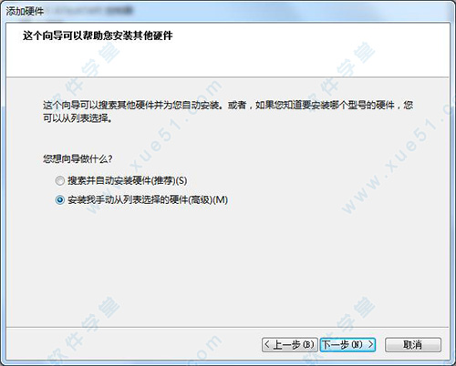 6、弹出“添加硬件”向导,选择“安装我手动从列表选择的硬件”;