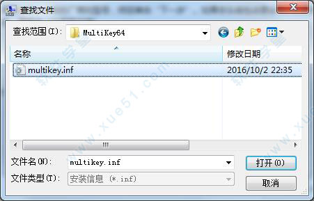 7、默认点击“下一步”,在硬件安装选择窗口中选择“从磁盘安装”按钮,浏览时选择附件上的驱动文件(下载安装包的MultiKey64里面的multikey.inf);