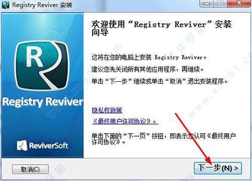 1、在本站下载完软件的数据包之后,双击“RegistryReviverSetup.exe”开始安装,在弹出的安装提示向导中单击“下一步”;