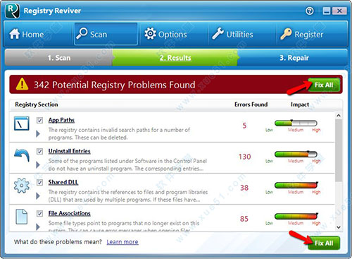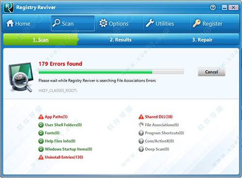 registry reviver是一款功能十分强大的电脑清理工具,它不是一般的清理工具,它能专门帮您清理您的注册表,让您的注册表保持干净,不受垃圾的干扰,有助于您的计算机更加高速的运转,实际上在卸载软件的时候,有的软件我们并不能彻底的把它卸载干净,会在注册表上留下各种不需要的文件,久而久之,注册表越来越来拥挤越来越多垃圾,电脑也随着越来越卡,运行速度越来越慢,使用它就能专门解决这个问题了,被称为目前最专业的注册表优化工具,采用了最新先进的扫描技术,能够智能分析你电脑中的错误,并移除所有失败的软件未使用的注册表项,错误安装/卸载和优化Windows操作,从而提高你的计算机速度和安全。本站提供