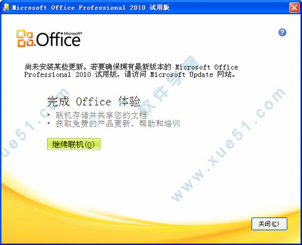 3、我们等待安装进度条完成后就可以进入到下图中的界面,这就表明PPT2010已经成功安装到你的电脑上,我们点击界面的关闭选项就可以关闭安装界面了。