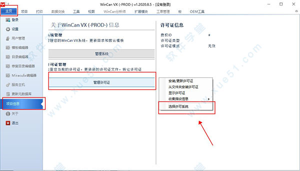 3、断开正在连接的网络,运行打开软件,选择主页-管理许可证-选择许可系统,下拉选择Wincan,点击OK