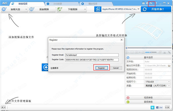 1、打开软件点击右上角的要是,然后会自动出来我们的激活码,点击register