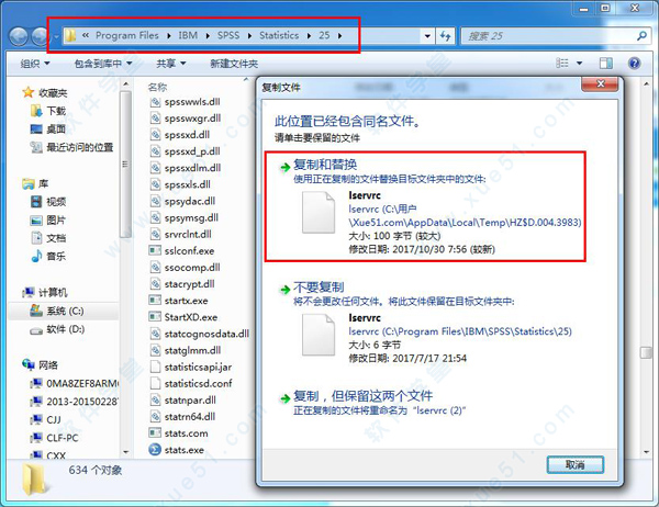 9、然后将安装包内“Crack.rar”压缩包下面的“lservrc”复制到软件的安装目录下,将原文件覆盖住,默认的安装目录为:C:Program FilesIBMSPSSStatistics25。