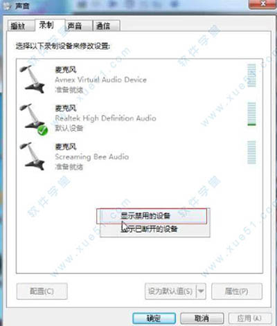 5、最后我们还要对语音进行设置,这个步骤非常重要不然语音不能在游戏中播放,我们打开录音设备--右键勾选显示禁用设备;