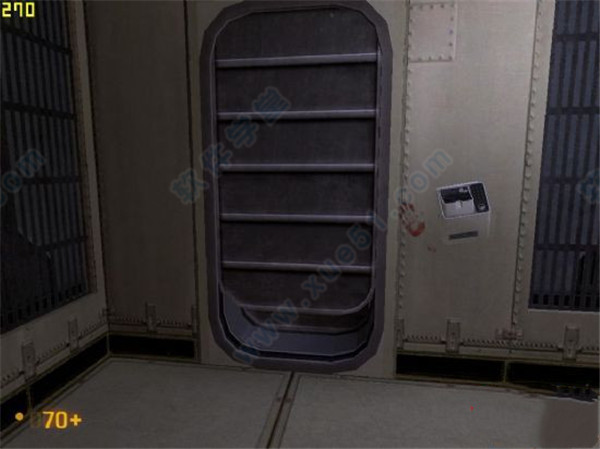 4、接着会遇到一面过不去的门,蹲着过去,过去后会看到电梯,蹲着过去,接着爬梯子上去。