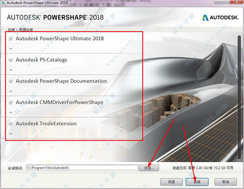 5、选择软件的安装功能和安装目录,根据自己需要的功能选择安装,安装目录可默认或点击浏览更改,注意:更改的安装路径中不要有中文字符的存在,完成选择点击“安装”开始安装;