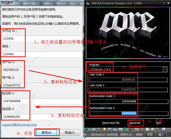 第三步:将激活页面的用户码1、2复制粘贴到注册机内。